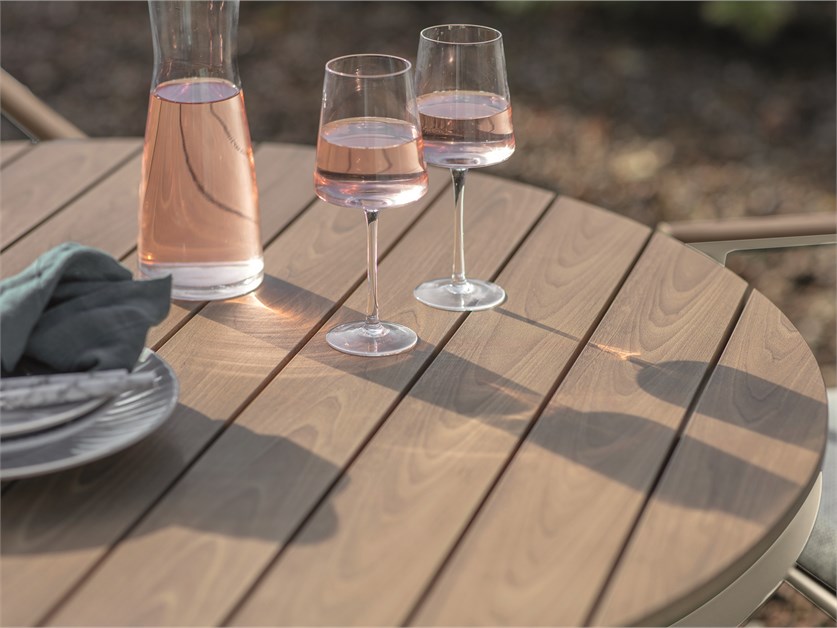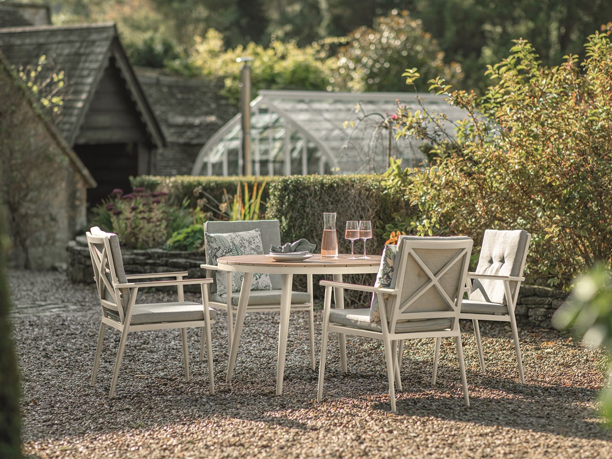 Designed in a lovely Mocha shade, the RHS Wisley collection blends beautifully with natural settings. Featuring criss-cross seat back detailing offset by a pared-back profile, and finished with complementary Mist-coloured fabric, it’s the ideal choice for those wishing for a simpler style. This season sees the introduction of new bar set additions, offering a relaxed and elevated way to enjoy outdoor spaces.