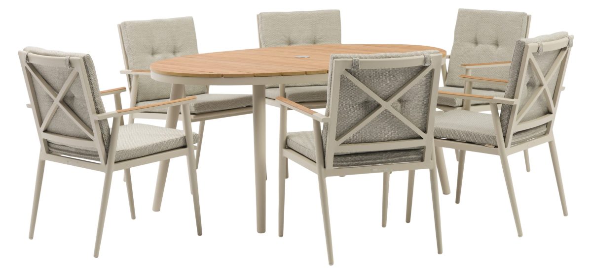 The Wisley range is part of an exclusive collection by Bramblecrest and the RHS. Featuring criss-cross seatback detailing and a pared-back profile this six-seat oval dining set in Sage blends beautifully with its natural surroundings.