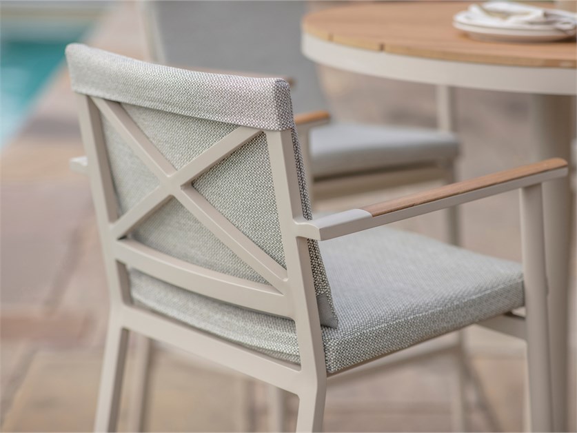Designed in a lovely Mocha shade, the RHS Wisley collection blends beautifully with natural settings. Featuring criss-cross seat back detailing offset by a pared-back profile, and finished with complementary Mist-coloured fabric, it’s the ideal choice for those wishing for a simpler style. This season sees the introduction of new bar set additions, offering a relaxed and elevated way to enjoy outdoor spaces.