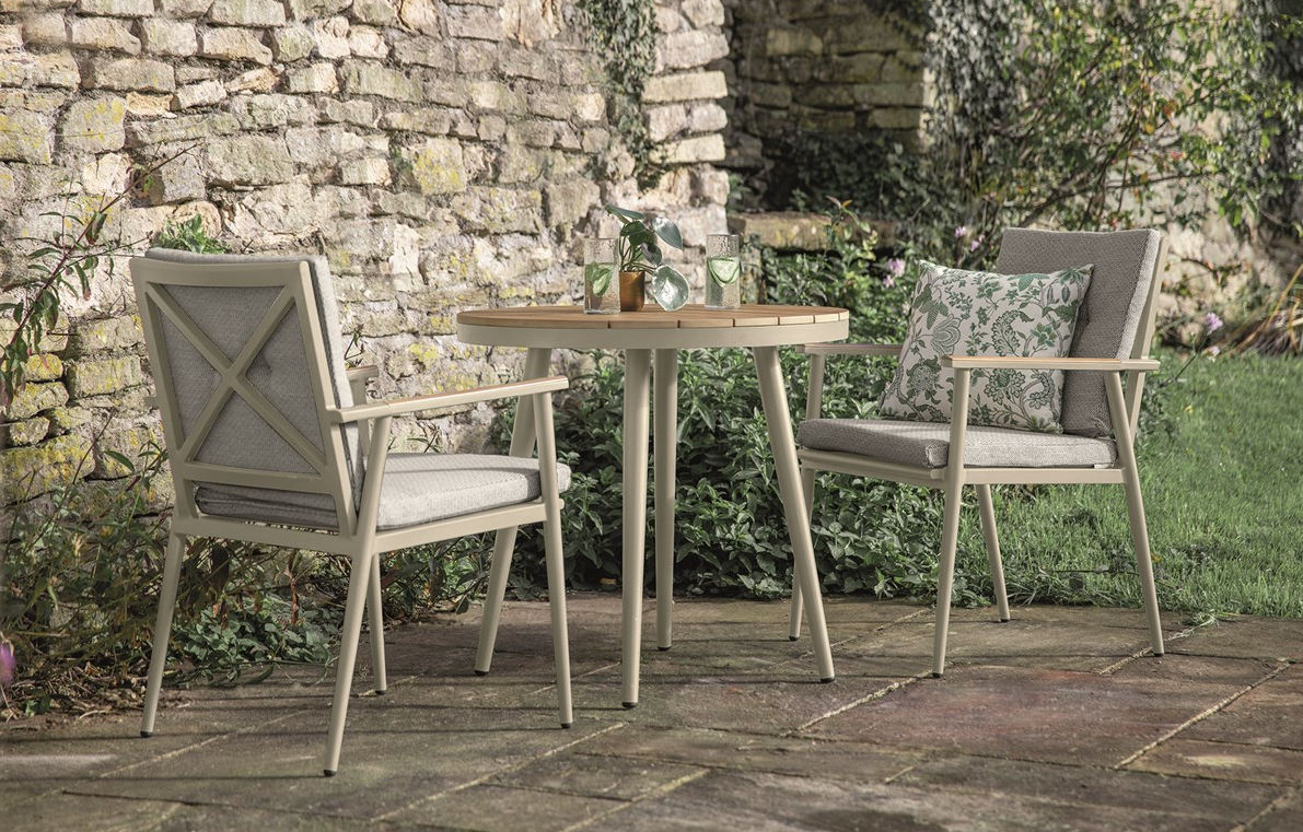 Designed in a lovely Mocha shade, the RHS Wisley collection blends beautifully with natural settings. Featuring criss-cross seat back detailing offset by a pared-back profile, and finished with complementary Mist-coloured fabric, it’s the ideal choice for those wishing for a simpler style. This season sees the introduction of new bar set additions, offering a relaxed and elevated way to enjoy outdoor spaces.