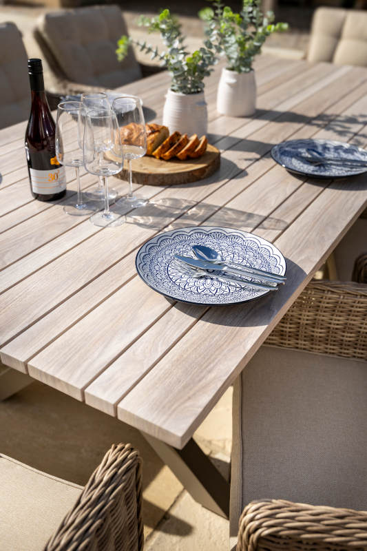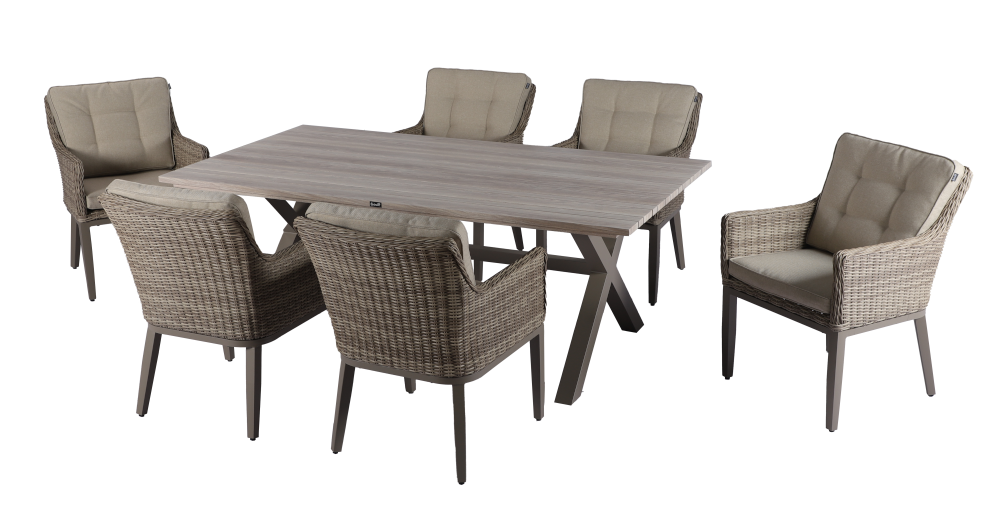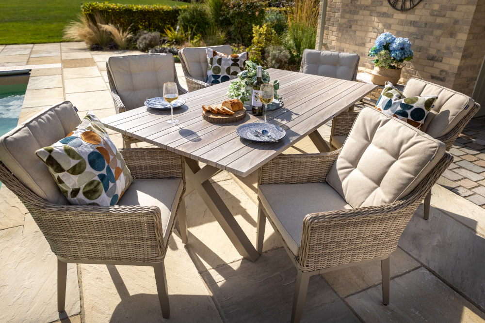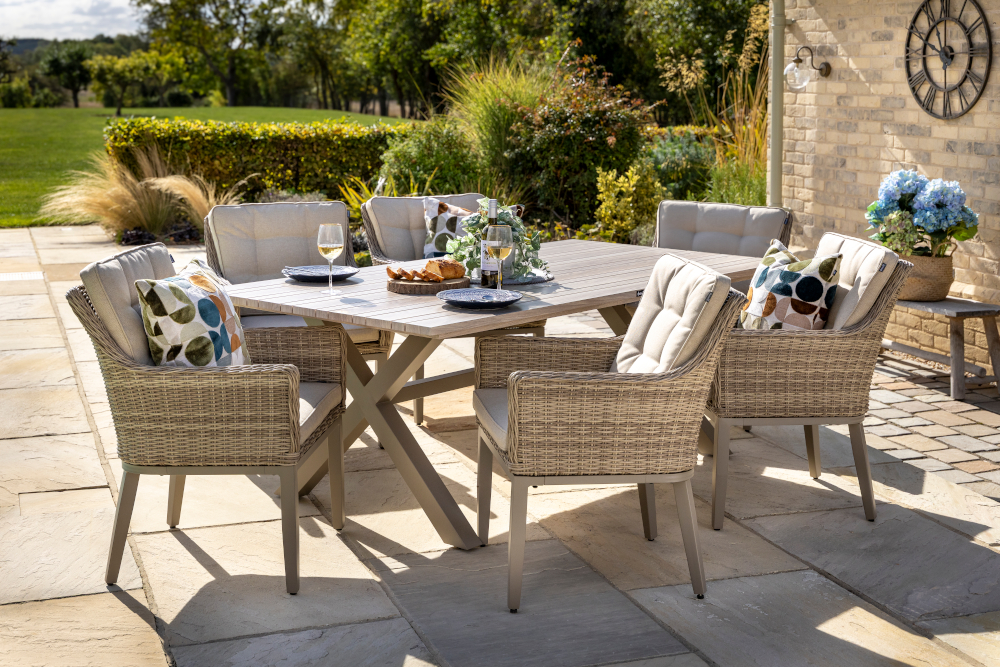Bring contemporary elegance to your outdoor space with the Arley 6 Seat Rectangular Dining Set. Featuring a beautifully designed Folie-wood look foiled aluminium tabletop, with slatted design, combines the natural warmth of wood aesthetics with the durability and low maintenance of aluminium. The set includes six spacious dining chairs crafted from handwoven resin weave and fitted with luxurious Weatherready® cushions—designed to withstand the elements while offering lasting comfort. Perfect for stylish alfresco dining in any season.