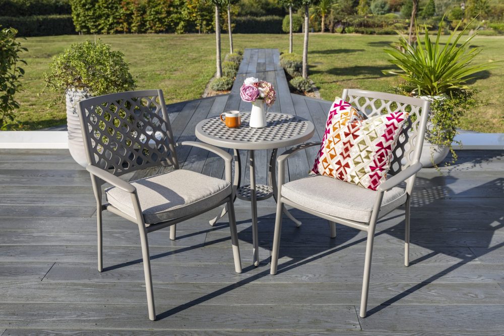 Perfect for a little nook in the garden or a balcony. The Avebury Bistro will quickly become a part of your outdoor living. Combining a modern teardrop with a solid, smooth finish this two seat and table set can be left outside in all seasons and still look beautiful in years to come. This set coordinates beautifully with other dining options in the full Avebury collection. Supplied with attractive Weatherready® cushions and supportive slanted backs, our Avebury chairs will ensure many relaxing moments on your balcony, patio or favourite sunny spot.