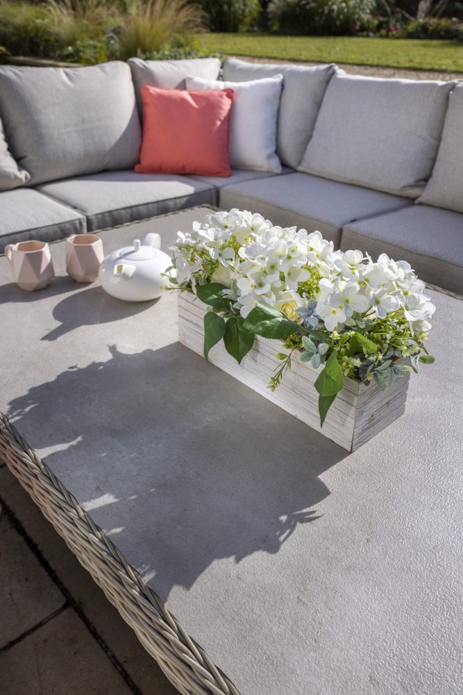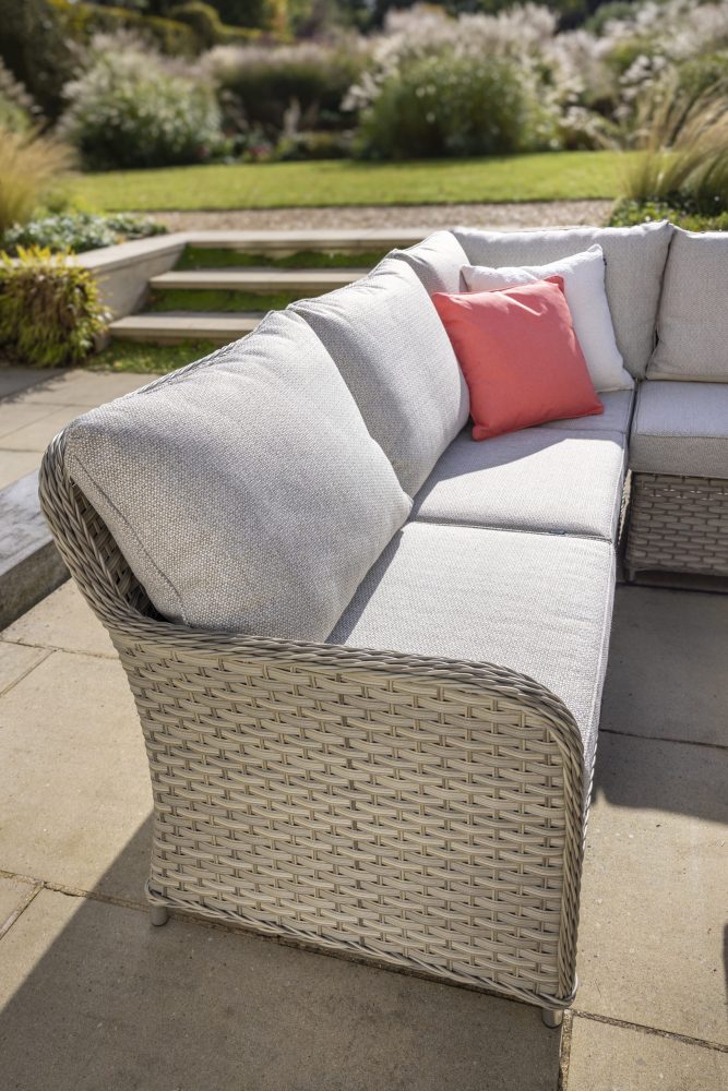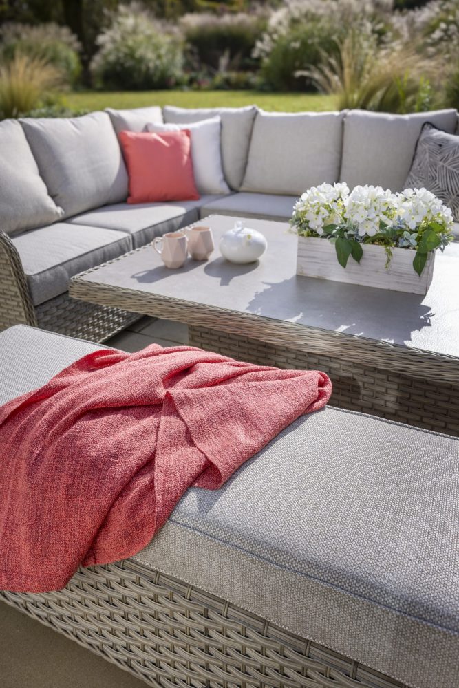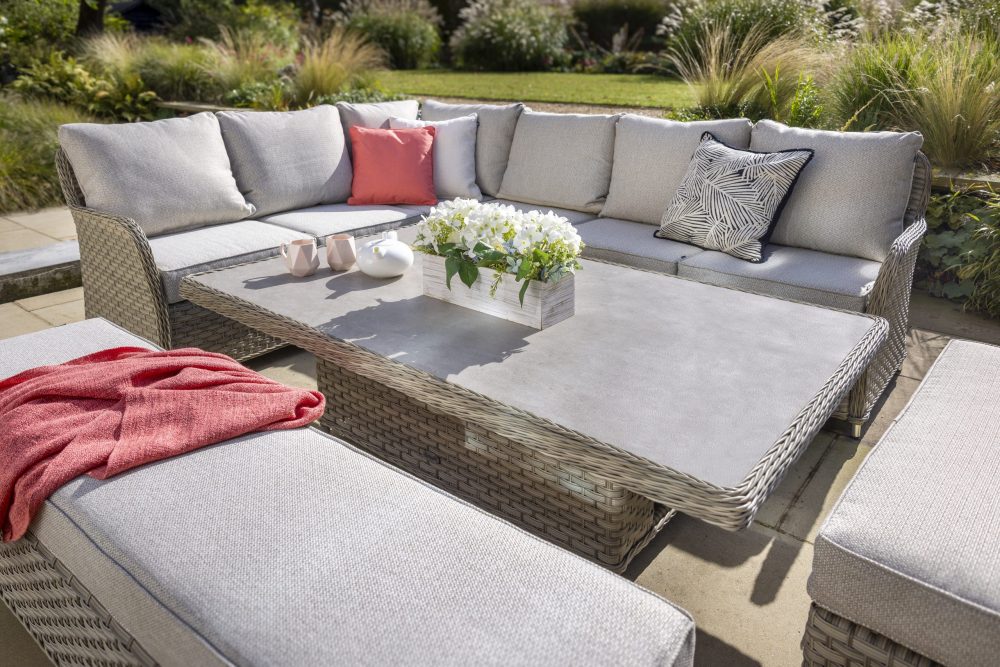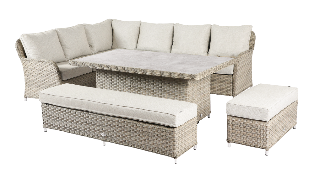 Make an impressive impact on your garden with this Eton Grand Rectangular Casual Dining Set. Socialising outdoors has never been easier with the corner dining set that offers ample room, thanks to a large corner sofa and benches that give everyone a seat. Enhancing your outdoor lifestyle, this corner sofa is finished with our luxurious, deeply filled, permeable Weatherready® cushions, allowing the set to be left outside during the summer months, while the table and seating (without cushions) can be left outside all year round. The generous seating for ten is complemented by a large Rectangular Adjustable Table. Dine informally and spaciously on the full Tuscan Ceramic table top, or lower for your day-to-day use with the family.