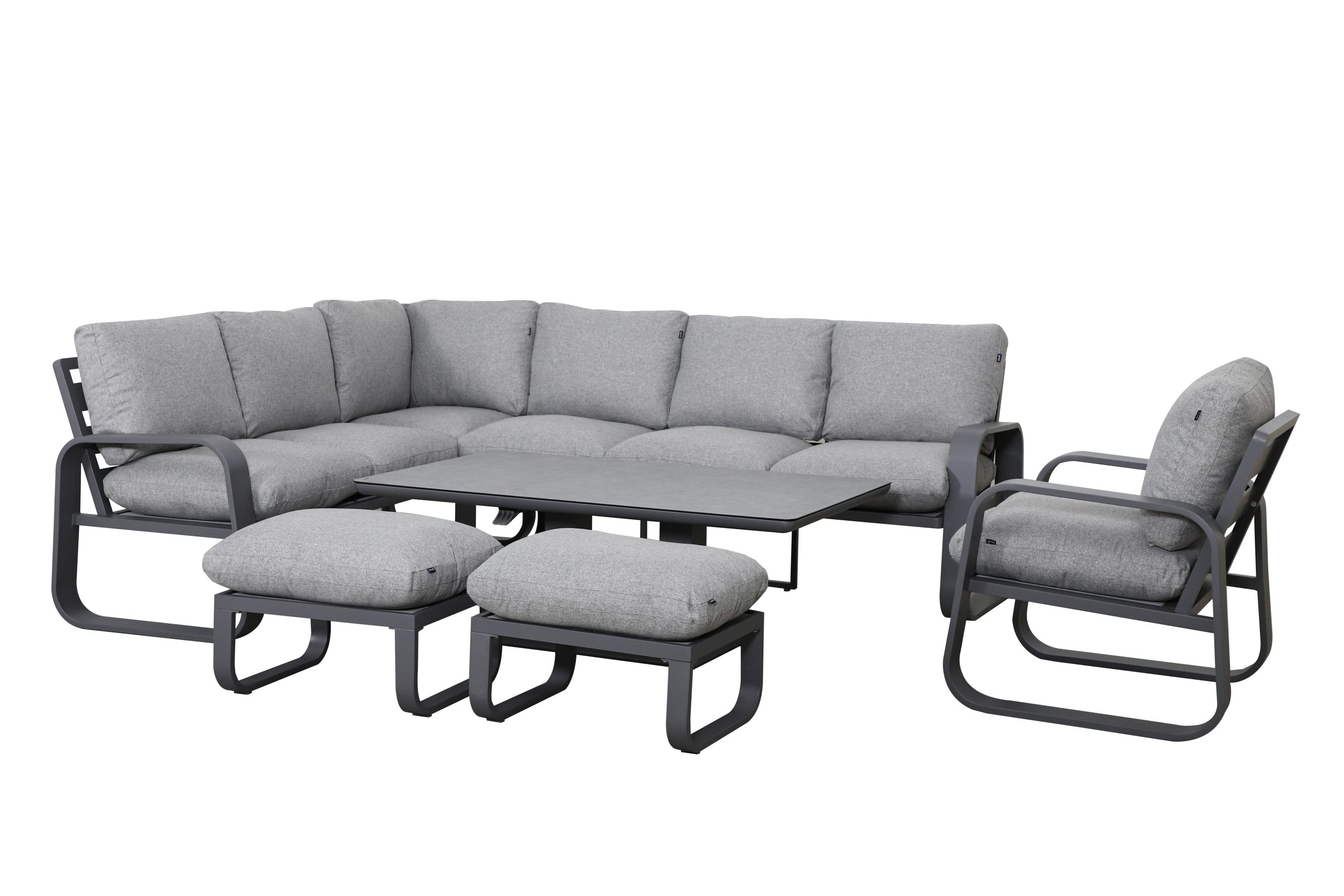 Picture yourself savouring a delightful brunch on a sunny morning or hosting a lively dinner party under the stars with the Orka Rectangular Casual Lounge Set. This set includes a spacious rectangular corner sofa, a lounge chair, and two stools all featuring Haze ultra-comfy Weatherready® CloudCushions® and a distinctive, eye-catching curved Oyster powder-coated aluminium frame. Additionally, it comes with a rectangular adjustable table with a Astro Tuscan Ceramic Glass table top that is both visibly appealing and lightweight yet durable. This set brings unparalleled comfort and style to your home. The cushions are designed to withstand various weather conditions, ensuring that they remain plush and inviting throughout the seasons. The Orka Rectangular Casual Lounge Set is perfect for relaxing summer days and evenings spent with loved ones. The generous seating arrangement allows for ample space to stretch out and unwind, while the adjustable table can be easily modified to suit your dining or lounging needs. The Astro Tuscan Ceramic glass table top adds a touch of elegance and sophistication, making it a stunning centrepiece for any outdoor setting. Embrace the delight of alfresco dining, create lasting memories with your loved ones, and revel in the luxurious comfort and style provided by the Orka casual dining set.