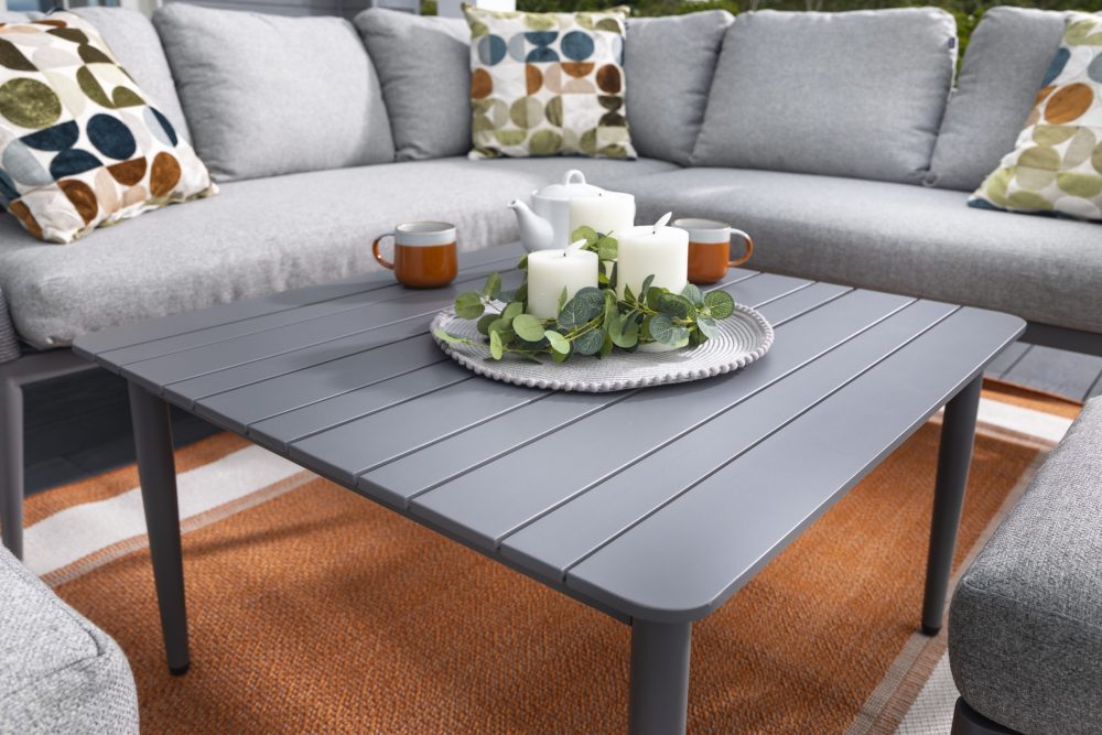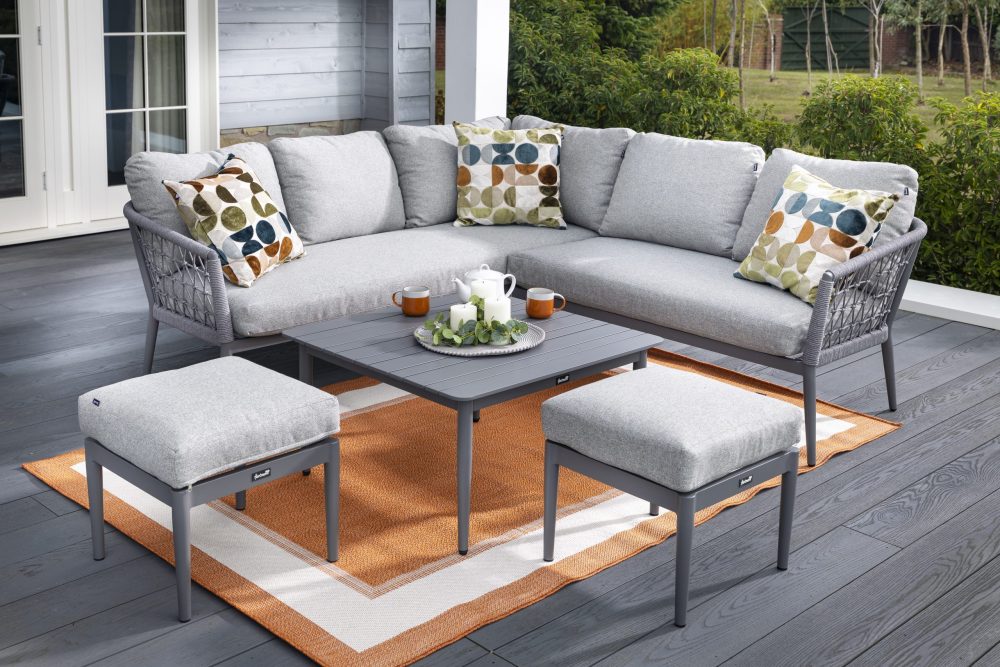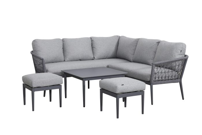 Create a contemporary outdoor retreat with the Tierra Square Corner Set. This elegant design features plush grey cushions on a durable, powder-coated aluminium frame — offering both style and comfort for relaxed garden lounging. The set includes a compact corner sofa, two matching stools, and a coordinating slatted coffee table, perfect for casual drinks or afternoon tea. Its sleek lines and woven weather-resistant rope detailing provide a modern yet inviting look, ideal for patios or decking areas.