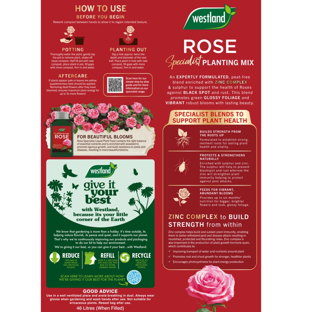 Westland Rose Planting & Potting Mix has been specially developed to give gardeners the ideal medium for planting all types of roses. Containing 6 months feed with added sulphur and zinc complex, this high performance compost offers unrivalled results in plant health, root establishment and moisture retention, helping to build the plant’s immunity against pests and diseases such as Blackspot and rust